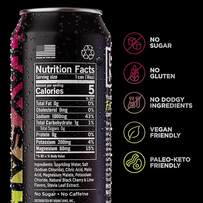 • OUR FORMULATION: Each can contains 1000 mg sodium, 200 mg potassium, 60 mg magnesium — a truly meaningful serving of electrolytes in a science-backed ratio. The same formulation as LMNT Drink Mix. Now Sparkling.