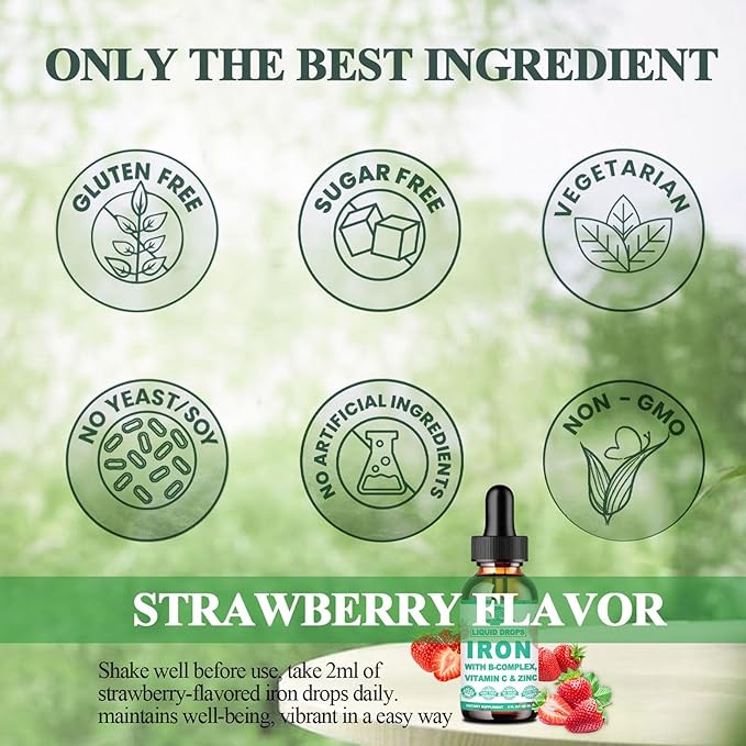 • EASY-TO-TAKE & EASY-TO-ABSORBED IRON DROPS: Not a fan of swallowing large pills? Our vegan iron drops supplement in liquid forms with strawberry flavor absorbed 5X faster and stronger by your body than iron pill, iron capsules, iron gummies, and giving it an excellent absorption rate of 98%, higher than other forms. Moreover, it's simple way to take iron and vitamin to your daily routines, just take 2 full droppers with coffee, water,drink or salad...Better promoted the regular and comfortable elimination of body toxins.