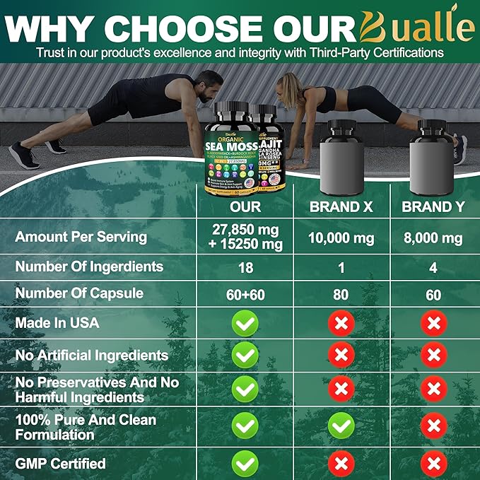 • 12-in-1 Sea Moss Formula:Our sea moss formula includes 12 powerful ingredients carefully selected based on scientific research.These powerful ingredients include Vitamin C,Vitamin D3,Sea Moss,Bladderwrack,Burdock Root,Black Seed,Ashwagandha,Black Pepper,and 4 extracts of Organic Mineral Complex. All ingredients are processed in the correct proportions to create a 12-in-1 sea moss capsule, providing you with excellent health benefits