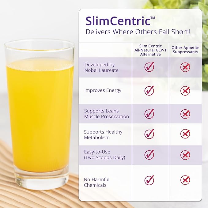• Formulated by Nobel Prize Winner: Developed by Nobel Laureate, Dr. Ferid Murad MD PHD. SlimCentric is a patented natural GLP-1 solution, providing a trusted, cost-effective, and natural remedy for your metabolic and lifestyle needs