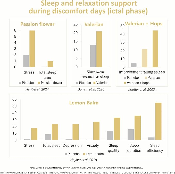 • MigReLax: Use for women and men during the migraine discomfort days of the ictal/migraine phase (premonitory, headache, postdrome, aura stages), as well as tension headache days to help your sleep and relaxation needs with valerian, lemon balm, passion flower, and hops