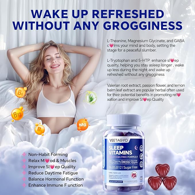 • 🌛Melatonin-Free Sleep Aid: Say goodbye to groggy mornings! Our melatonin-free formula supports a restful night's sleep without the next-day drowsiness. Sweet dreams guaranteed! With an effective formula to promote natural zz💗z.Our melatonin-free gummies are your best choice! 5-HTP, is a precursor to serotonin, is converted into melatonin that is involved in regulating natural Zz💗z cycle. Combines L-Tryptophan, which can increase the concentration of serotonin in the brain, promote the formation of melatonin for better zz💗z.