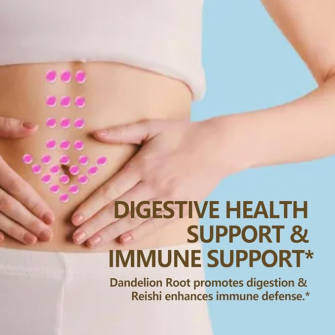 • DIGESTIVE HEALTH SUPPORT & IMMUNE SUPPORT: Our vegan supplement also helps elevate digestive levels and immunity. Dandelion Root traditionally aids digestion and absorption, reducing bloating and heartburn. Combined with Licorice, it supports cell repair and regeneration to safeguard gut health. Additionally, our wellness formula integrated Reishi and Turmeric. They enhance immune balance and natural defense, restoring your body's energy.*