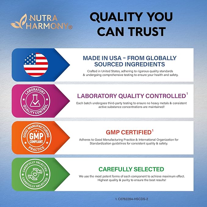 • Trustworthy Service — At NUTRAHARMONY, we are committed to providing only premium-quality supplements, including our carefully crafted sleep support capsules. With our natural sleep aids for adults, you can trust that you’re receiving a scientifically formulated supplement designed to aid better sleep & relaxation. Our exceptional customer service ensures that your satisfaction is our top priority, making your wellness journey as seamless and trustworthy as possible.