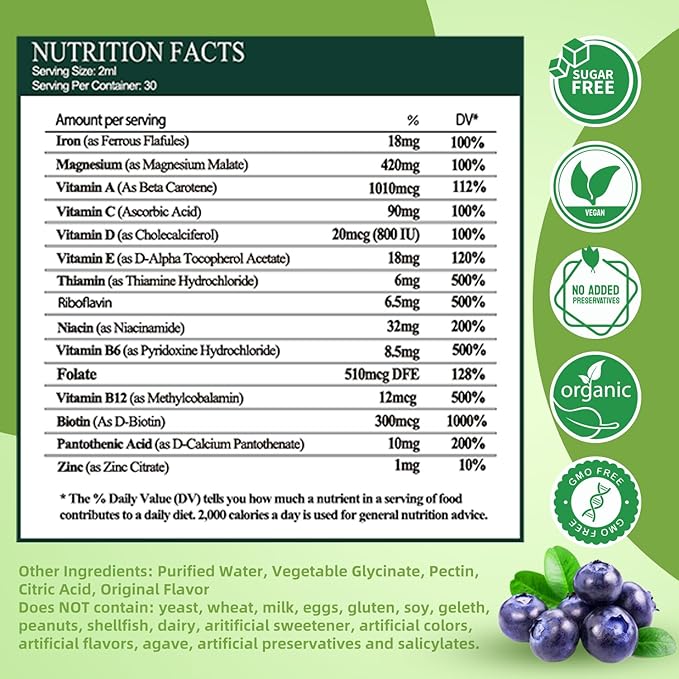 • HIGH POTENCY LIQUID IRON WITH MULTIVITAMIN: The energy support fomula contains 18mg highly bioavailable form of ferrous chelate Iron, Magnesium, a natural source of Vitamin A C D, and vibrant B-complex vitamins (B1 to B12, ) to optimize iron absorption and utilization. The high potency liquid iron with multivitamin ensuring a substantial boost for adults dealing with iron deficiency or anemia*, support energy and overall wellness