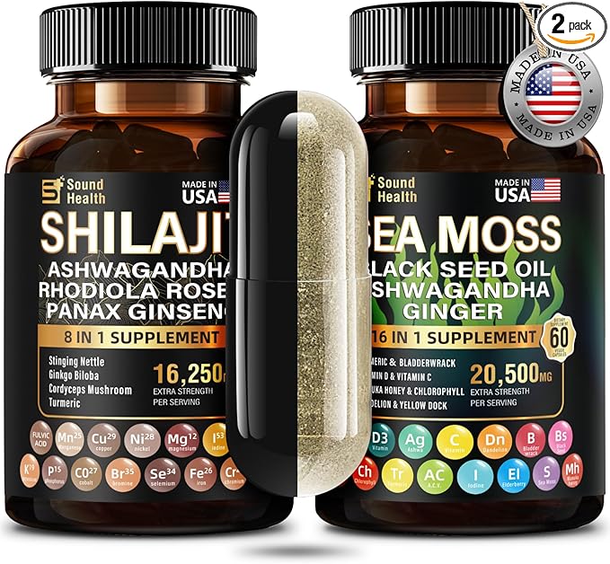 Wild Organic Irish Sea Moss and Shilajit - 8000mg Sea Moss, 10000mg Shilajit, Ashwagandha 2000mg, Ginseng, Vitamin C, Vitamin D3, Black Seed Oil - 2 Bottles of 60 Capsules