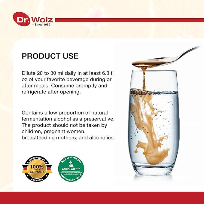 • OPTIMAL USE - Discover the effectiveness of our daily immune support formula, expertly formulated for targeted release and enhanced with Dr. Wolz's specialized fermentation process using Enzyme Yeast Cells, ensuring resilience against stomach and digestive acids. Just dilute 30ml per day in at least 6.8 fl oz of your preferred beverage during or after meals. For a refreshing option, try mixing it with apple juice. Remember to consume promptly and refrigerate after opening to maintain freshness.