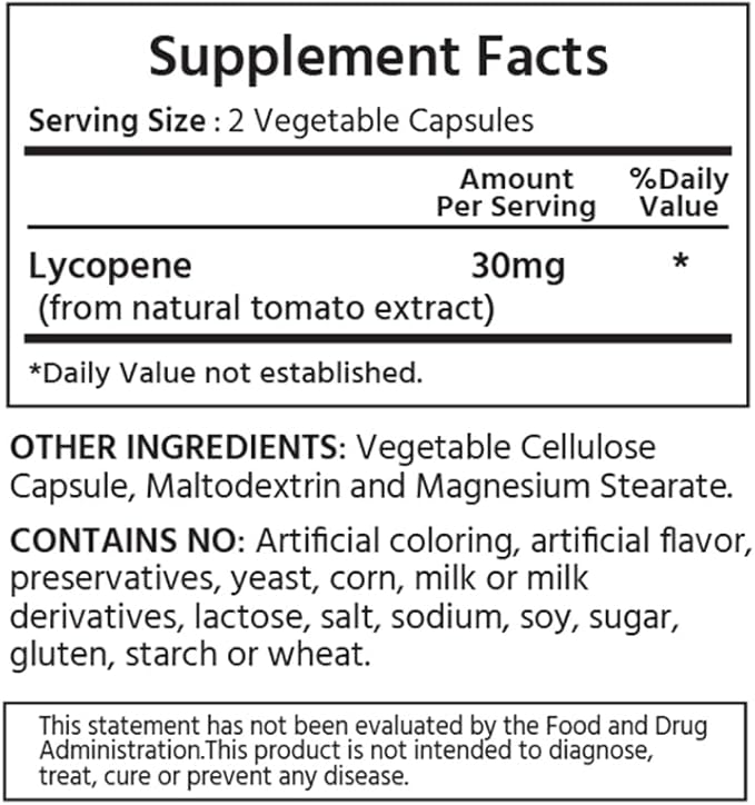 • Bioavailable Pure Lycopene: Natural Lycopene contains 30 mg of bioavailable pure lycopene per serving.