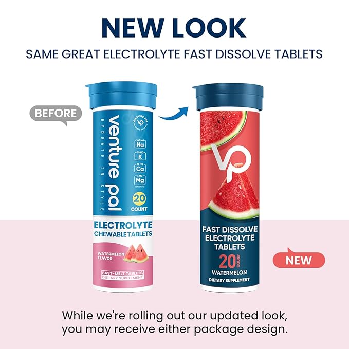 • VENTURE PAL ELECTROLYTE CHEWABLE TABLETS: Introducing our newest innovation, the Chewable Bite-sized Fast-Melt Electrolyte Tablets that take effect almost immediately. Rich in essential electrolytes - sodium, magnesium, potassium, and calcium - they replenish vital electrolytes lost through sweating, helping to maintain hydration during daily exercise and endurance training, reduce heat stress, and alleviate leg cramps