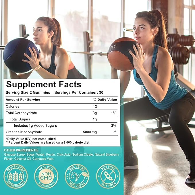 • NATURAL BLUEBERRY FLAVOR: Enjoy the refreshing taste of our low-sugar creatine monohydrate gummies. Absorbs faster than pills or capsules and is suitable for a variety of dietary needs. Soy-free, non-GMO, gluten-free, dairy-free, and vegetarian-friendly