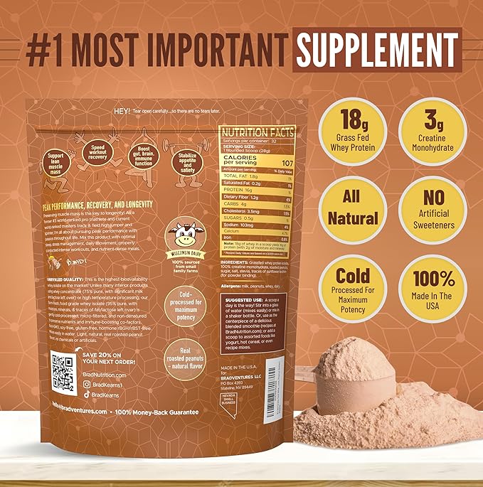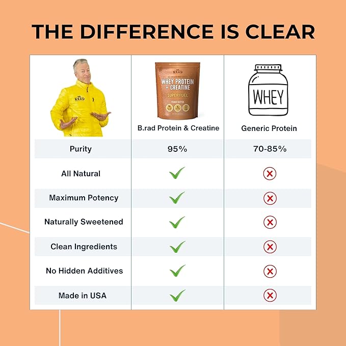 B.rad Grass-Fed Whey Protein Isolate Powder with Creatine | All-Natural, Ultra-Pure, Clean Ingredients | 100% USA-Sourced Superfuel | 2 Pounds | Peanut Butter