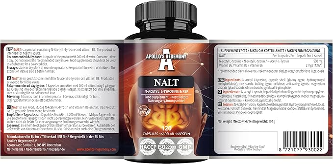 Apollo's Hegemony N-Acetyl-L-Tyrosine (NALT) 500mg and Active Vitamin B6 (P-5-P) 2mg - 120 Capsules - 4 Months Supply - High Strength Amino Acid Supplement - Cognitive Booster