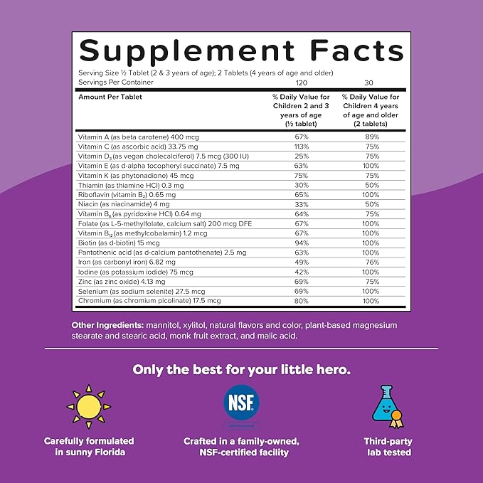 • How to take: Children 2-3 years old take 1/2 tablet daily; children ages 4 and older take 2 tablets daily; our vitamins melt in your kids’ mouth or can also be dissolved in water, juice or even smoothies. Kids can chew them or let them melt without worrying of anything getting left behind on their teeth