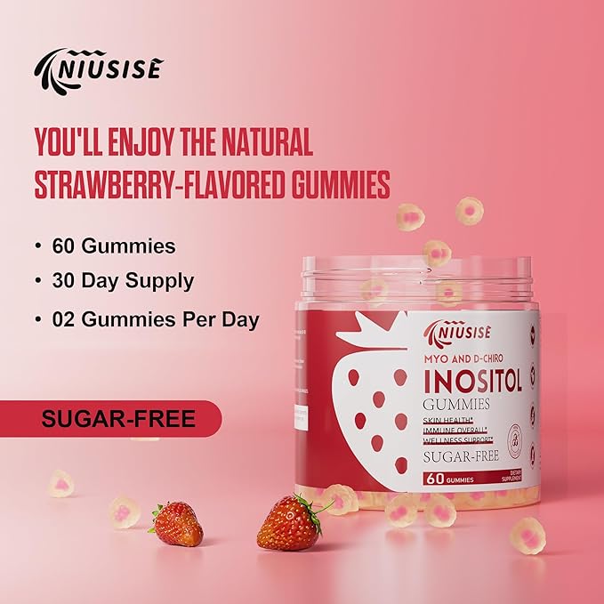 • SUGAR-FREE AND CHEWABLE– Say goodbye to swallowing hard-to-swallow pills! Indulge in the refreshing Strawberry-flavored sugar-free gummies that are perfect for on-the-go. These vegan and gelatin-free gummies make it effortless to remember your daily inositol intake. Whether you're seeking a healthier alternative or a convenient travel companion, these gummies make supplementing enjoyable.
