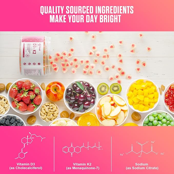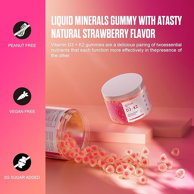 • HIGH QUALITY GUARANTEE - This VITAMIN D3 + K2 is tested and meets our high standards for purity, freshness and potency with Strawberry flavors from natural sources and 0g sugar added. Every product is carefully sourced, formulated, and manufactured to meet the highest quality standards.