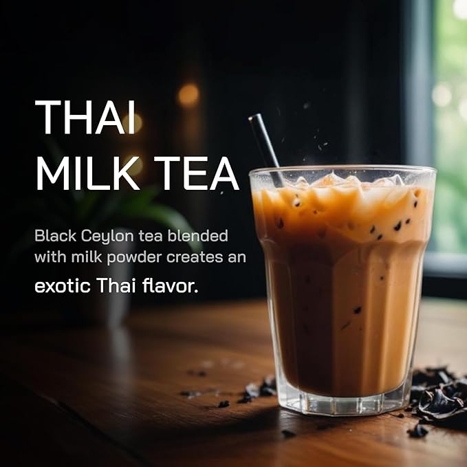 • Indulge: Exotic Thai Milk Tea Flavor. Savor the rich taste of Ceylon black tea and milk powder perfectly blended. This distinctive twist lifts the exotic flavor and cheer to those who seek a bold and invigorating life.