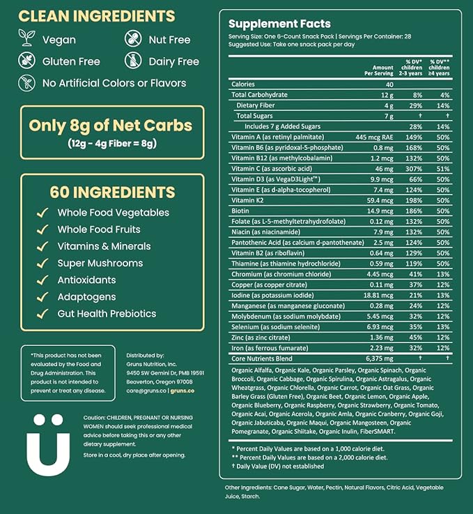 • Formulated to Fit Your Life: At Gruns, we believe that foundational nutrition should be simple and convenient for everyone. We’re dedicated to bringing comprehensive and complete nutrition to you through our gummies, formulated from 60 nutrient-dense and whole-food ingredients.