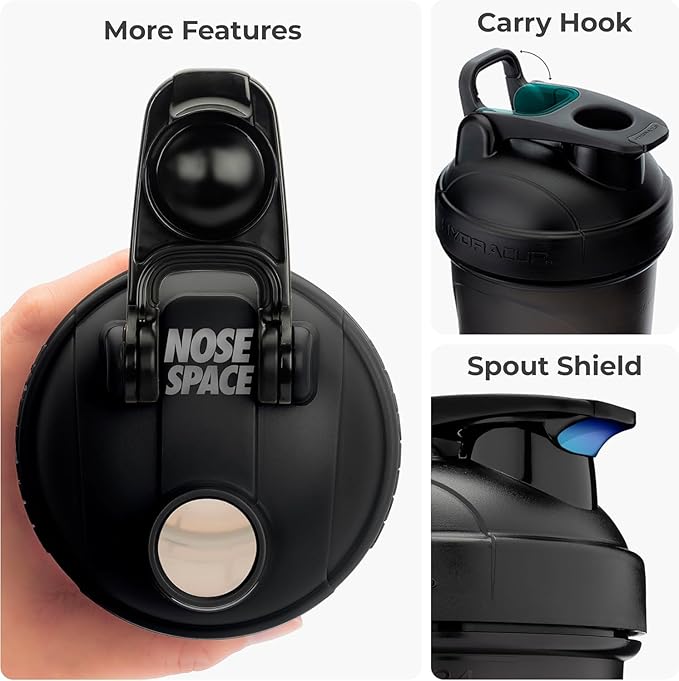 • OTHER FEATURES - Hidden Carry Hook, Nose Space for comfortable drinking, Additional Whisk Included, Easy Clean Bottle Base, Printed Measurement Lines, BPA FREE