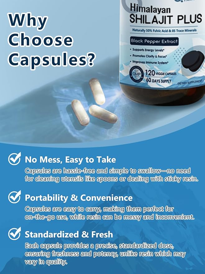 • CONVENIENT CAPSULE FORM: Compared to shilajit resin or shilajit gummies, our shilajit comes in capsule form. No need to clean a spoon after each dose, easy-to-swallow capsules that won't leave a weird taste in your mouth after taking it, precise dosage control