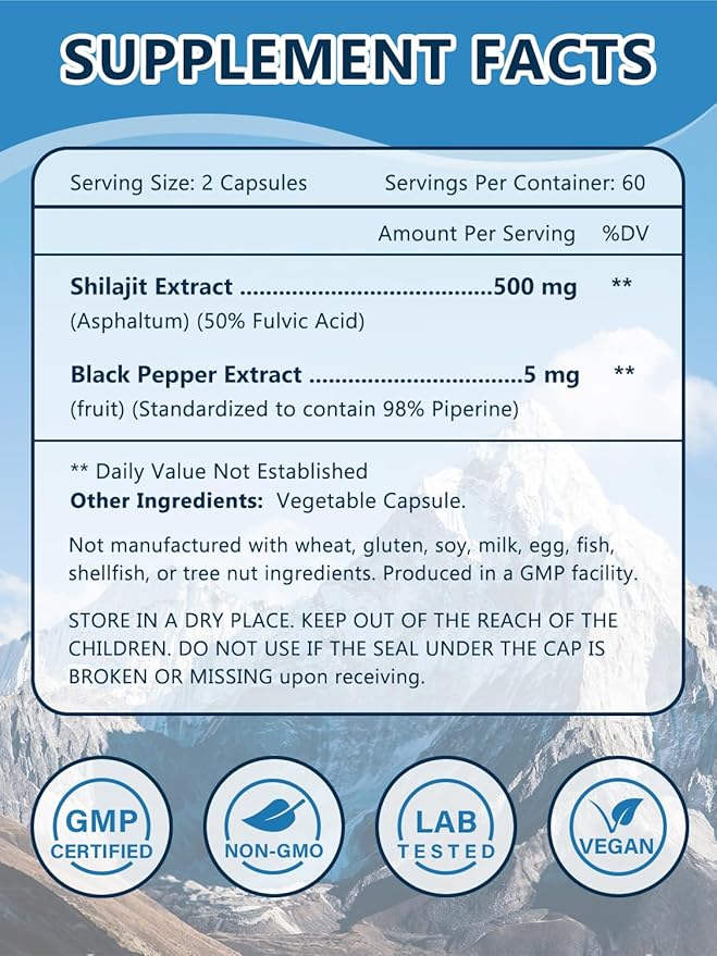 • 60-DAY SUPPLY: Each bottle of shilajit supplement contains 120 veggie capsules, a 2-month supply to ensure the shilajit is fresh and effective. Easy to swallow, take two shilajit capsules daily for maximum effectiveness