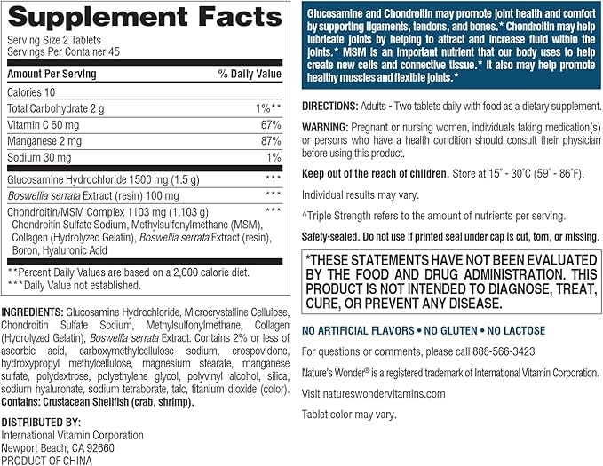 Nature's Wonder Triple Strength Glucosamine & Chondroitin with MSM and Hyaluronic Acid and Boswellia for Joint Health, Supports Joint Flexibility and Mobility, 45 Day Supply, 90 Tablets