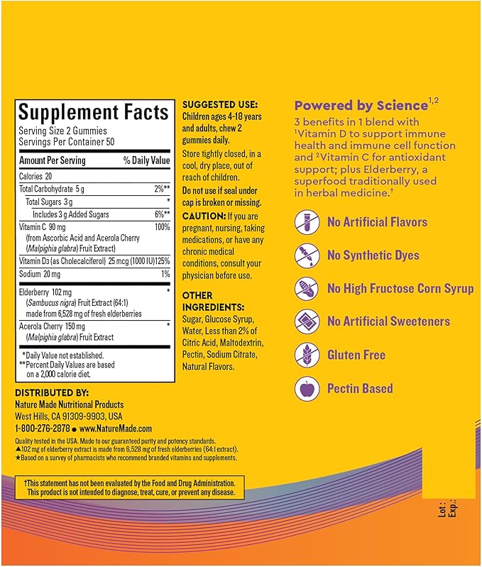 • SUPERFOOD IMMUNE SUPPORT SUPPLEMENT FOR KIDS & ADULTS: Nature Made Wellblends Immune & Superfood Gummies is a 3-in-1 blend of Elderberry, Vitamin D and Vitamin C