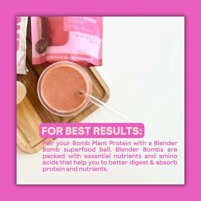 • HOW TO USE & SUPERCHARGE YOUR SMOOTHIE: Mix one scoop of Bomb Plant Protein with 8 oz of liquid or add it to your favorite smoothie. For an elevated smoothie experience, pair it with a Blender Bomb superfood ball. The combination provides a nutrient-packed option that includes all 9 essential amino acids and tons of nutrients, perfect for your daily smoothie routine. Simply drop in a Blender Bomb, add frozen fruits or veggies, pour in your liquid, and blend for a powerful, plant based snack or meal.