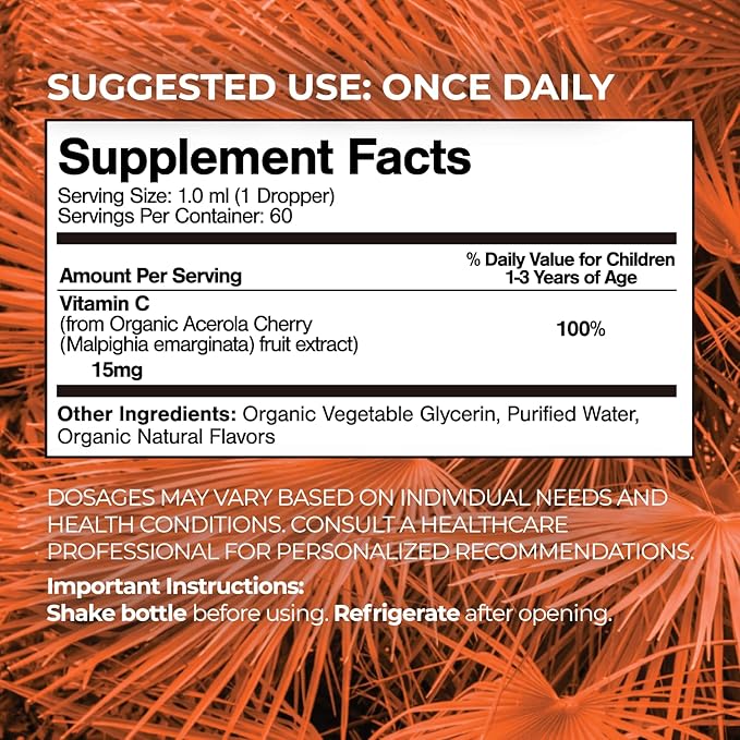 • Tropical Oasis Organic Vitamin C Drops for Toddlers — Support your growing toddler’s immune system with our organic Vitamin C liquid drops. Since the body can't produce Vitamin C naturally, it's essential to get it from outside sources. Our Vitamin C is derived from organic acerola fruit extract, which is known to have higher Vitamin C content than typical citrus fruits.