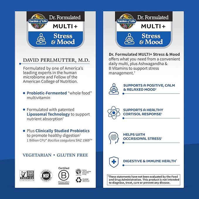 Garden of Life Dr. Formulated Multi+ Stress & Mood, Fermented Liposomal Multivitamin + Ashwagandha, B Vitamins & Probiotics - 60 Capsules, Whole Food Vitamin & Mineral Supplement