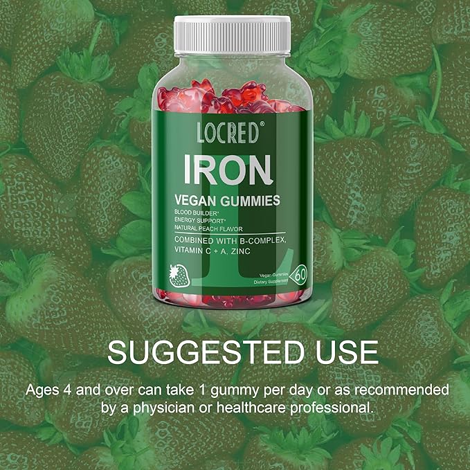 Vegan Iron Gummies,Multivitamin with Iron, Folate,Zinc for Man and Women,Strawberry Flavor (60 Ct)