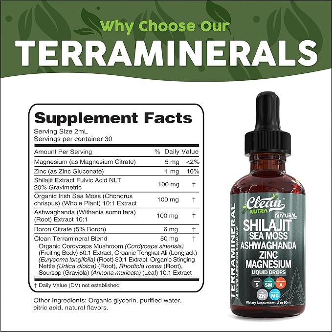 Shilajit Liquid Drops with Sea Moss, Ashwagandha, Zinc, Magnesium, Liquid Vitamins for Women and Men - Terra Mineral by Clean Nutra