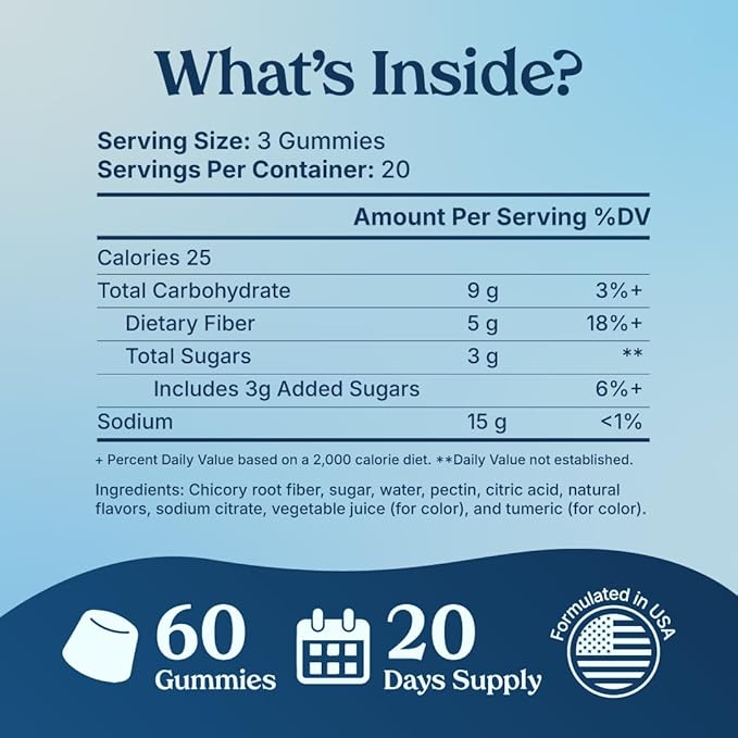 • Each bottle contains 60 gummies, providing a 20-day supply of consistent fiber support. The portable design makes it easy to maintain your gut health routine whether you're at home, work, or traveling.