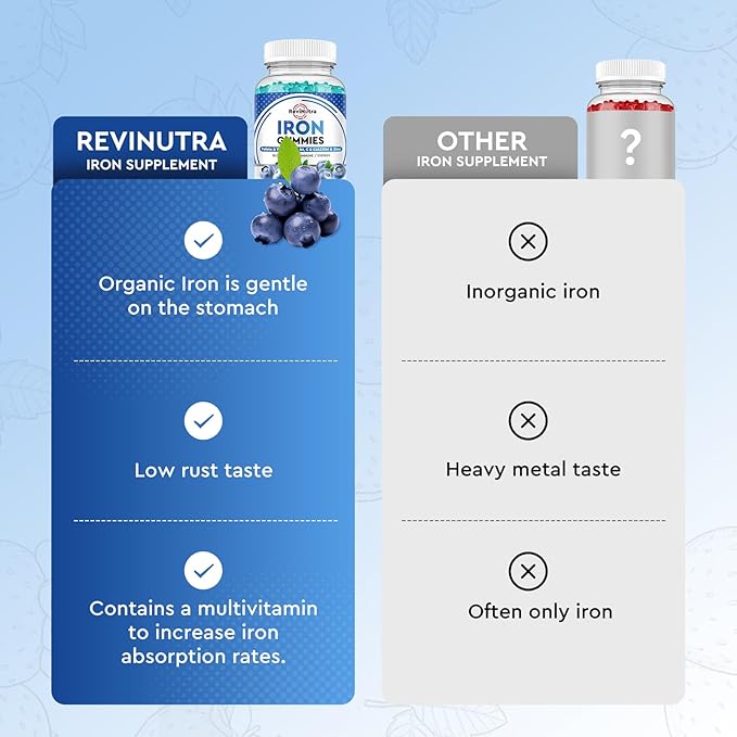 • DELICIOUS GUMMIES FOR THE WHOLE FAMILY - Just 2 convenient Iron gummies Everyone in your family will love our blueberry-flavored gummies, which are easy to chew and have a pleasant taste for men, women, and children. Absorb into your system faster than with pills or capsules. If you're unhappy with your purchase, please contact us