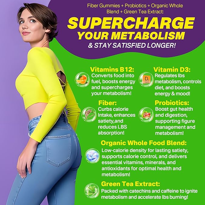 • [Enjoy Healthy Metabolism]: Our Fiber Vitamin Gummies are uniquely formulated to boost metabolic. Unlike other brands, we combine green tea extract with a nutrient-rich organic whole food blend to help burn excess nutrients and boost antioxidant levels. Additionally, our probiotics optimize gut health. Prebiotic and probiotic fibers enhance digestion and nutrient absorption, while vitamins B12, D3 help you stay energized every day. Enjoy the present with our fiber gummies designed for adults.