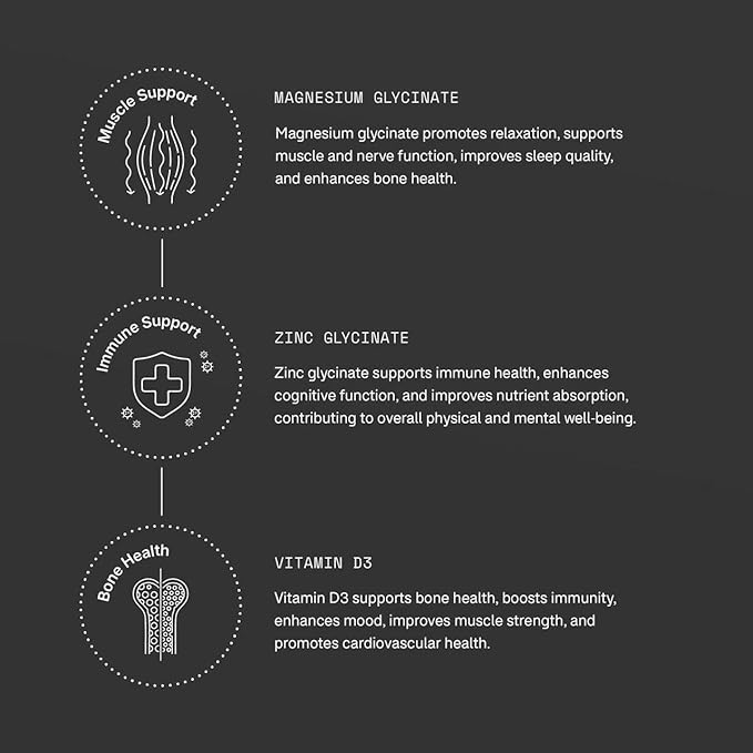 • TRIPLE ACTION FORMULA - Combines three essential nutrients — Magnesium Glycinate, Zinc Glycinate, and Vitamin D3 — to support cardiovascular, cognitive, and musculoskeletal health.