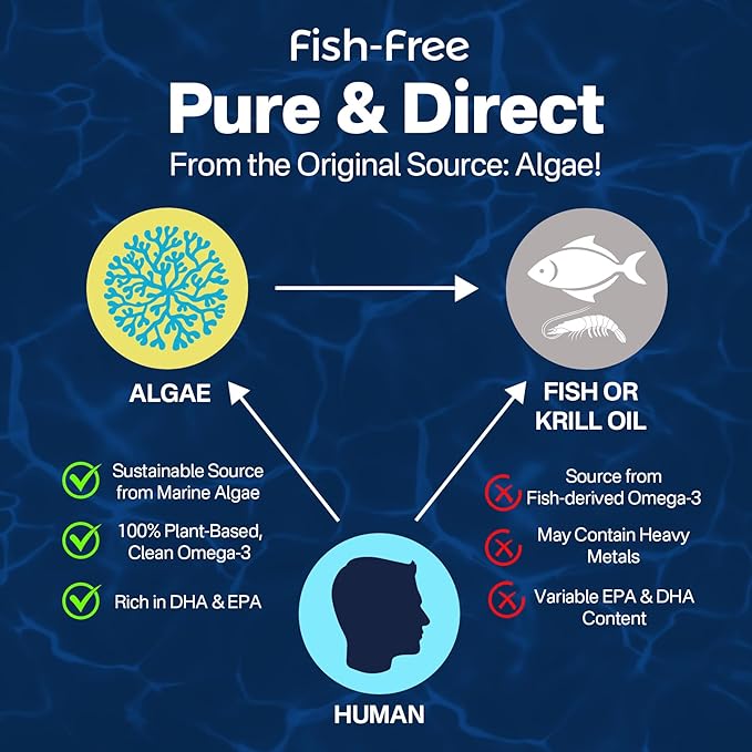 • GOLDEN BALANCE OF DHA & EPA - 2:1: Our Algae Oil Omega 3contains 720mg of DHA and 360mg of EPA. The 2:1 golden ratio is essential for brain development and cognitive function. DHA helps ensure the nervous system develops and functions properly. Vegan Omega-3 oil provides a high-quality source of EPA and DHA, the two essential omega-3 fatty acids, in bioavailable forms that are easily utilized by the body. Just 2 softgel a day, enjoy purer, fish-free omega 3 fish oil supplements.