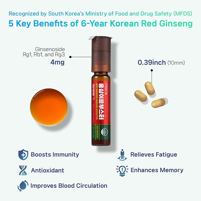 • 🪴Ready-to-Drink 6-Year Korean Red Ginseng: Each bottle contains 20g of premium Korean red ginseng extract with 4mg of ginsenosides (Rg1, Rb1, Rg3) to enhance overall health, vitality, and immunity.