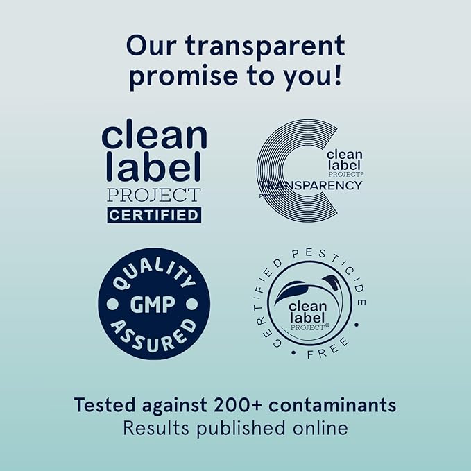 • Full Transparency: We strive to make the cleanest products. Every batch of every product is reviewed for purity and potency by The Clean Label Project. They use independent laboratories to test against 200+ contaminants and publish the results on their website using the respective batch number.