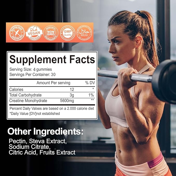 • [ Key Benefits]: Our Creatine monohydrate gummies are an easy way to consume, 4 gummies per serving, you can take it at any time, any place. It improved muscle strength, muscle recovery, improve endurance and energy boost. Suitable for a variety of users, and enjoyable taste.