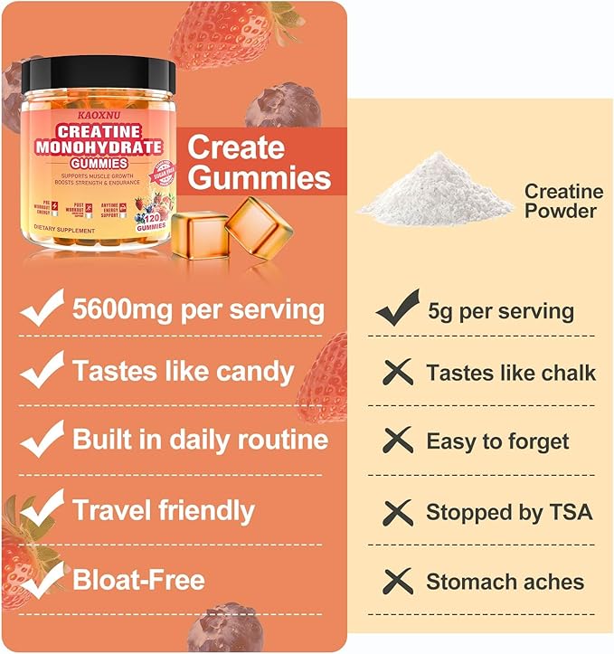 • [Creatine Monohydrate Gummies]:Creatine is one of the most effective, safe, and well-studied supplement to improve performance,increased muscle endurance,muscle growth or recovery. Just 4 gummies per serving to meet your daily 5.6g creatine requirement. Get ready to get bigger, stronger, and push beyond your limits — naturally.