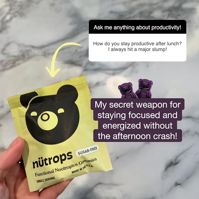 • No Mess, No Stress: Nutrops is thoughtfully formulated to be a delicious and seamless addition to your daily routine with our convenient snack packs, perfect for travel or on-the-go schedules. Each pack contains 8 tasty low-sugar gummy bears with only 9g of natural cane sugar. It’s best to take first thing in the morning to power your day or in the afternoon for a pick-me-up. 28 packs, 224 gummies total.