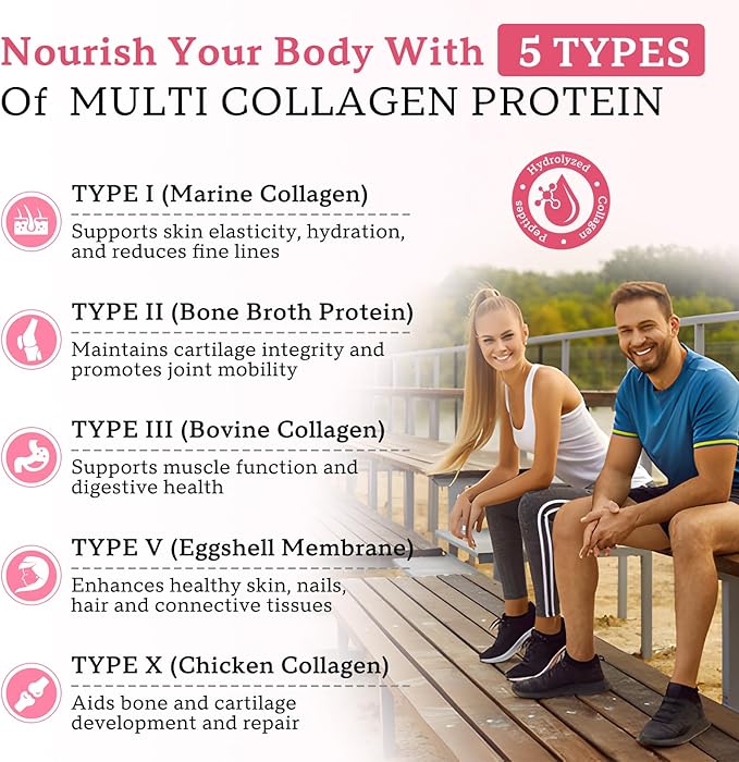 • Support Joint Health & Bone Strength: Multi-collagen supplements, all 5 types of collagen hydrolysate I, Il, Ill, V & X, are designed to promote joint comfort and strengthen bones. These biotin collagen keratin supplements support connective tissues, enhancing flexibility, reducing discomfort, and maintaining bone and joint integrity. Additionally, collagen gummies help build strong muscles, boost energy and metabolism, and support brain function for overall musculoskeletal and cognitive health