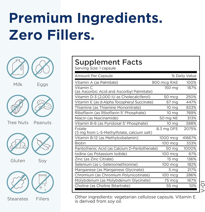 • Filler-Free Folate Supplements - Pure l methylfolate 5 mg with no bulking agents, stearates, brans, starches, glues, or binders. Womens and mens multivitamins made without gluten, dairy, eggs, and nuts.*