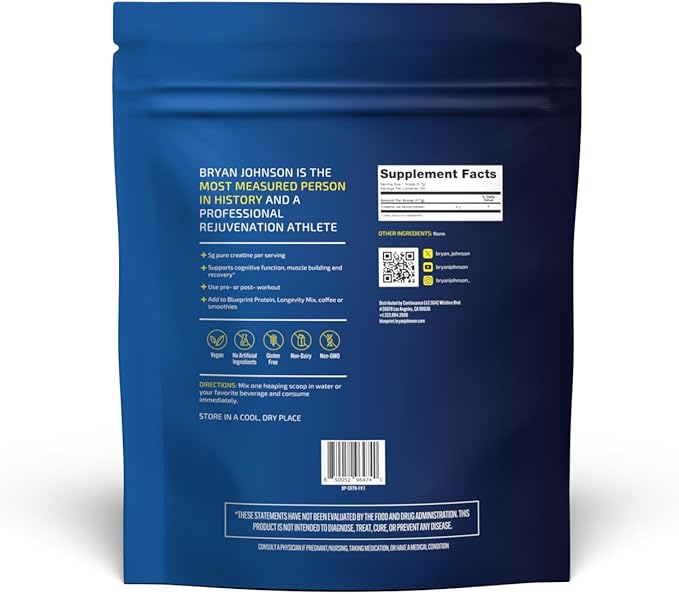 • LONGEVITY BIOACTIVE: Creatine monohydrate is a powerful longevity bioactive as it supports muscle cells, muscle structure and function. Bryan currently consumes 5g of creatine per day, with the dose based on results from clinical trials.